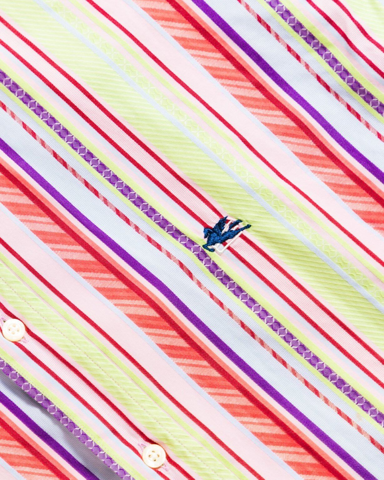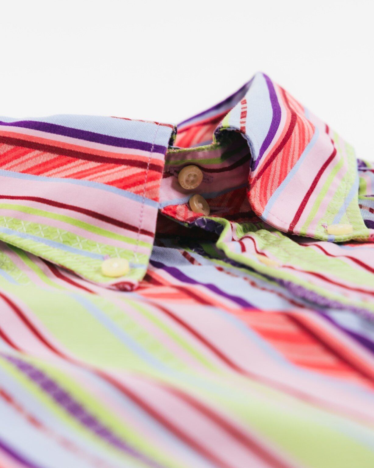 グリーン、ピンク、ブルー、ライラック、レッド、パープル…と軽やかな多色使いながら、一見無秩序に見える配色を、緻密なテキスタイル設計で構成し、調和の美へと昇華させています。