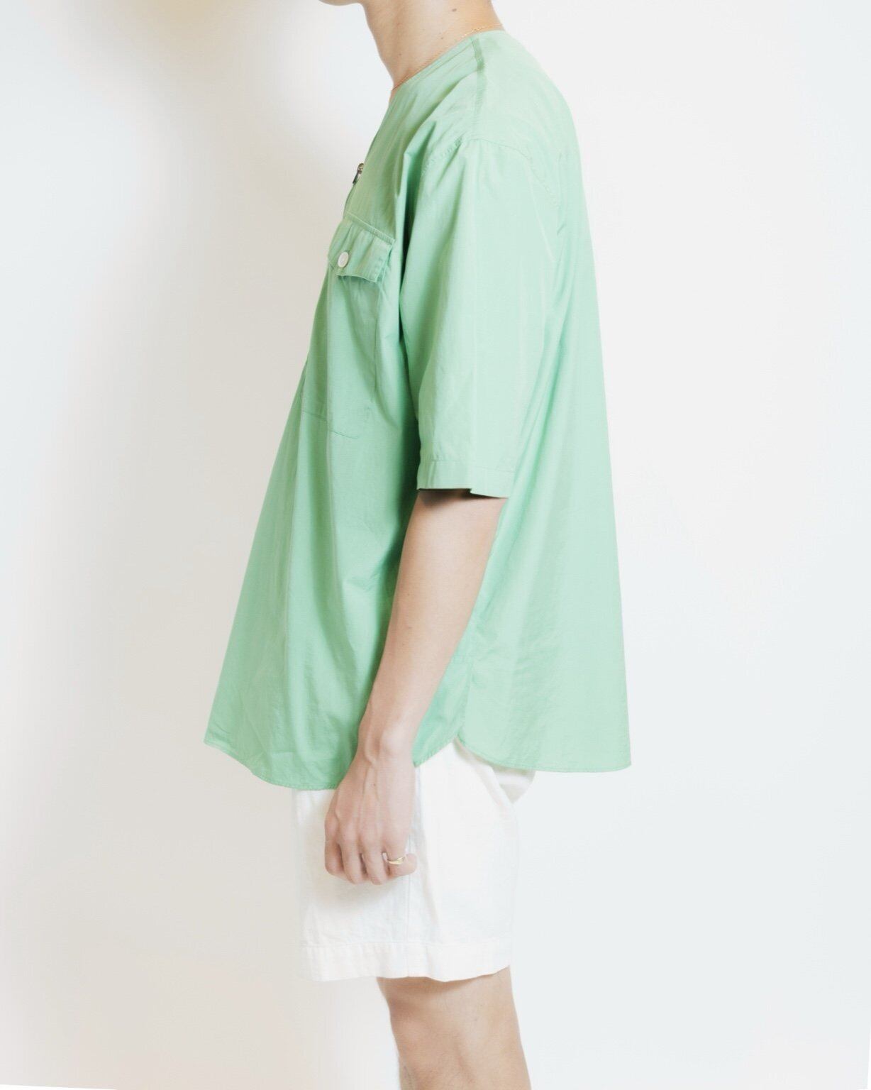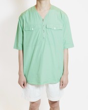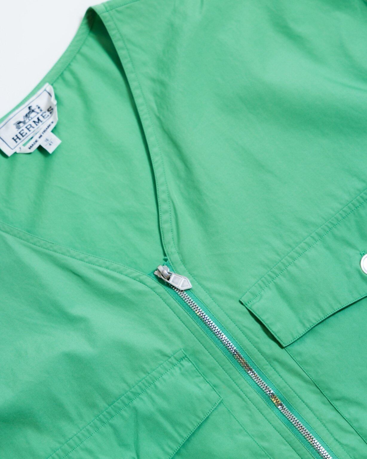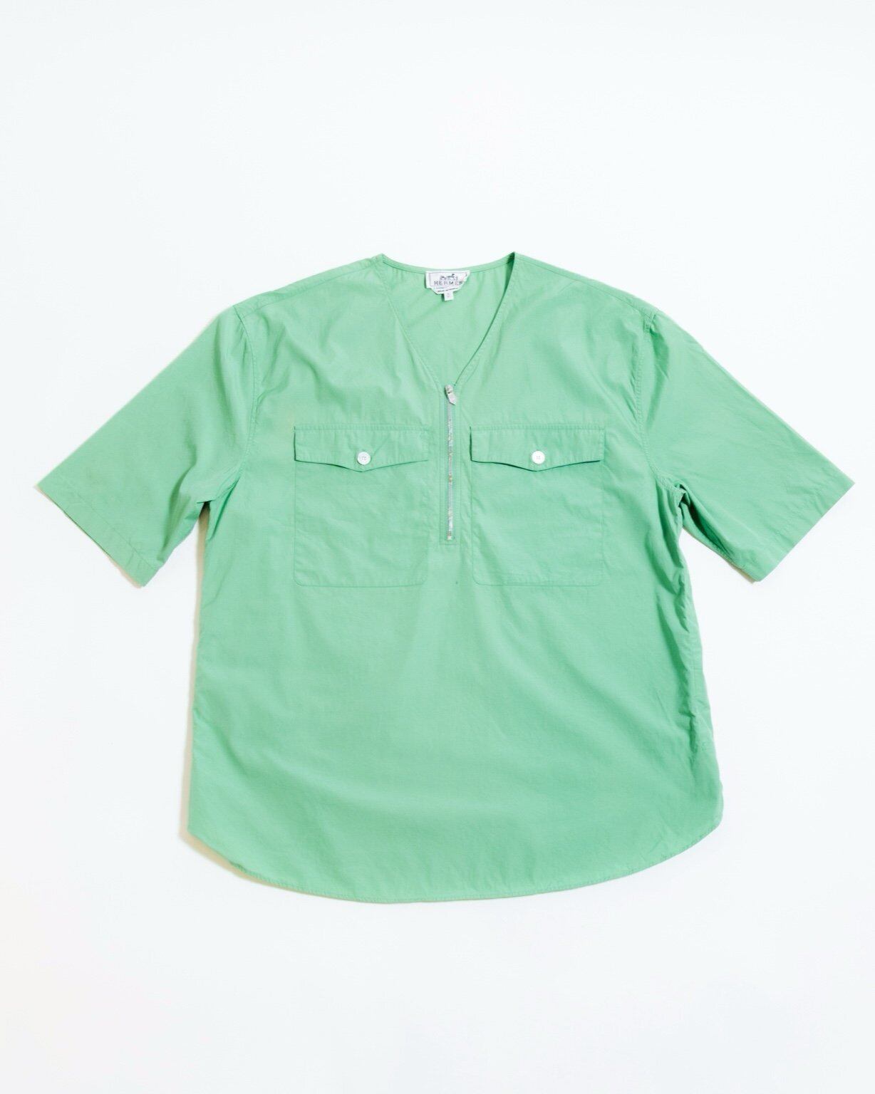 本作はエルメスのアーカイブの中でも希少な、フロントジップ仕様のコットンシャツ。ミントグリーンの鮮やかな発色が爽やかで、夏らしい軽やかさを纏っています。深めのVネックラインにジップを配し、胸元にはフラップポケットを配置。カジュアルなディテールながら、シルエットや素材の上質さがエルメスらしい気品を演出します。