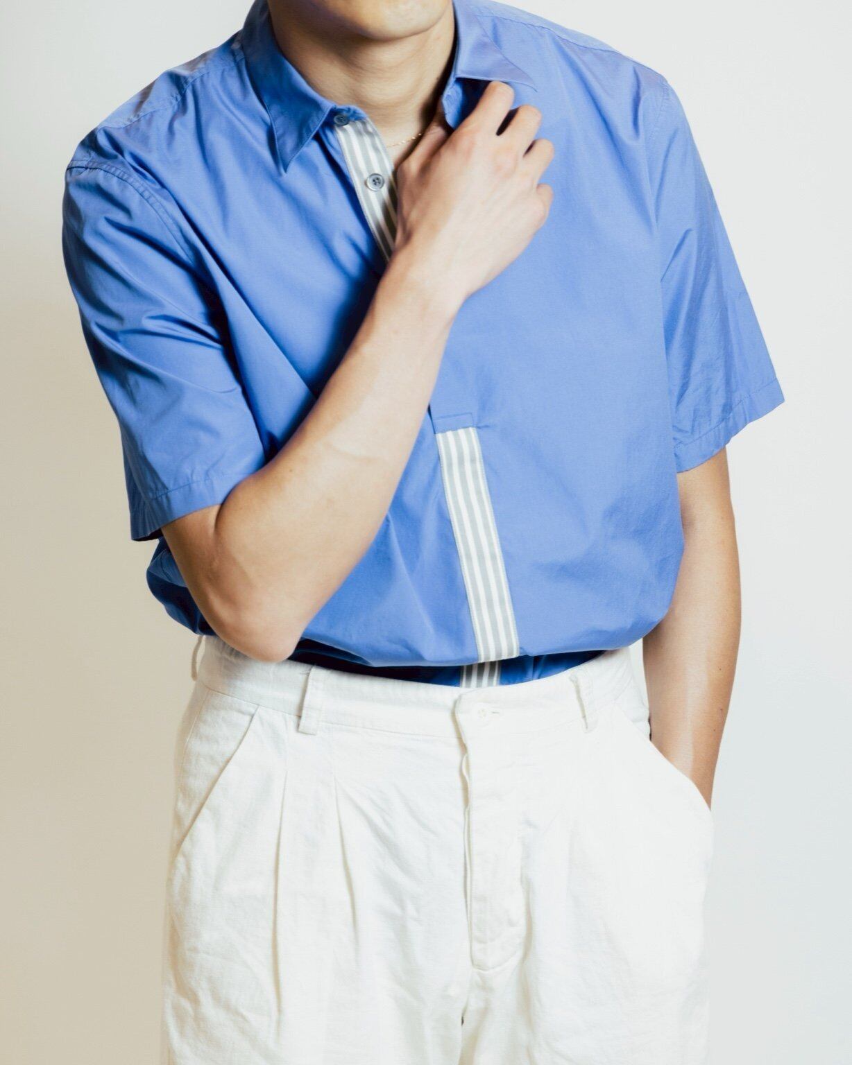 夏のカジュアルウェアでありながら、布地そのものに深みと艶が宿り、動きや光の加減によって青がわずかに表情を変えていきます。その色彩は、地中海の空を思わせるほど鮮やかでありながら決して派手すぎず、身に纏った人の存在感を静かに引き立てます。
