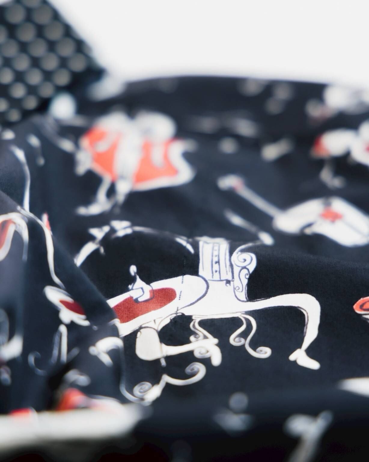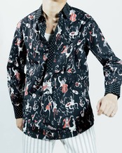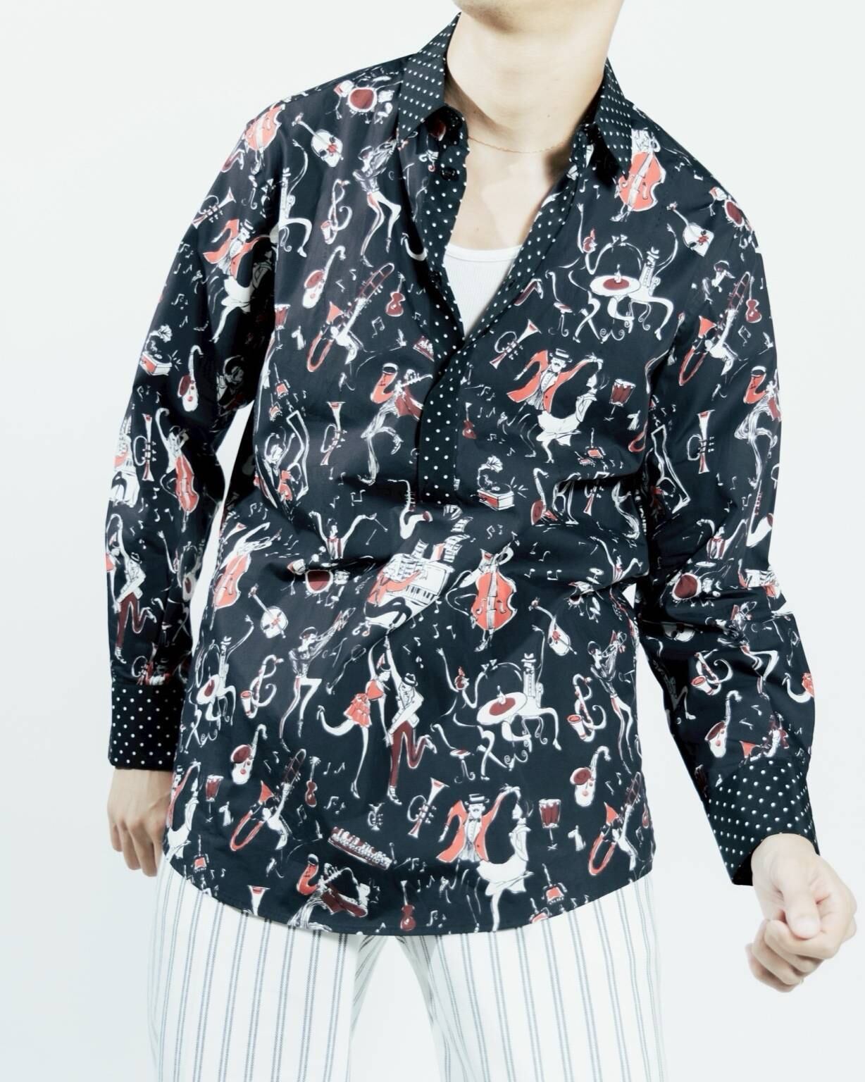 大胆な音楽モチーフの総柄に加え、前立てと袖口にはポルカドットを切り替えたデザインが施され、ブランドらしい遊び心が存分に感じられる一着です。