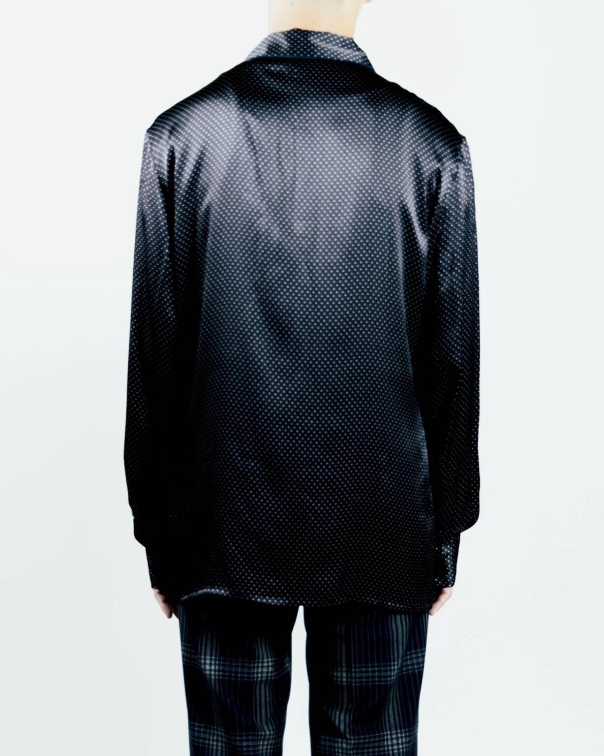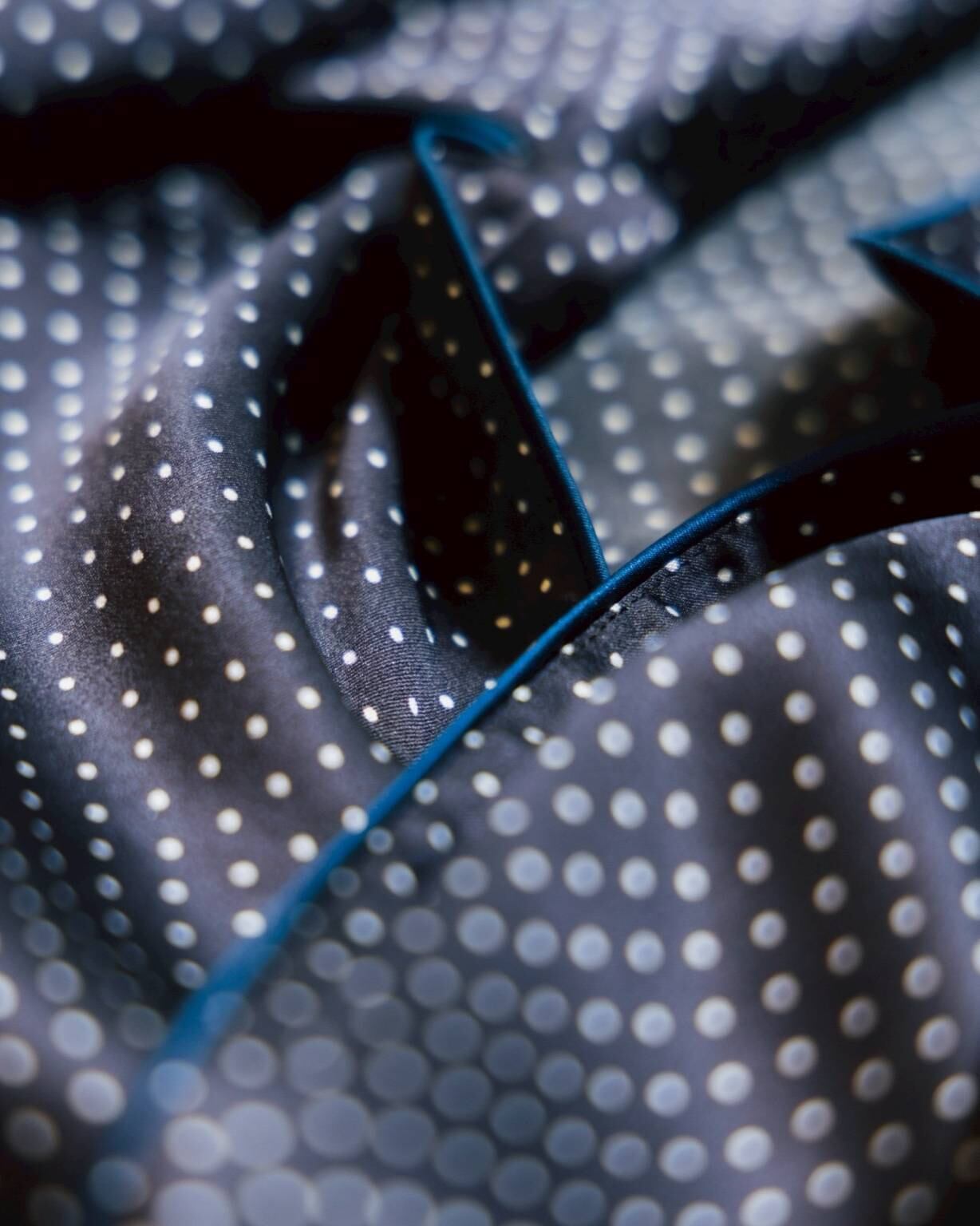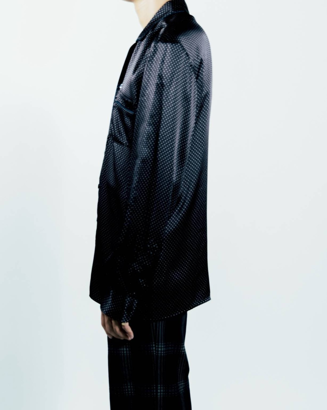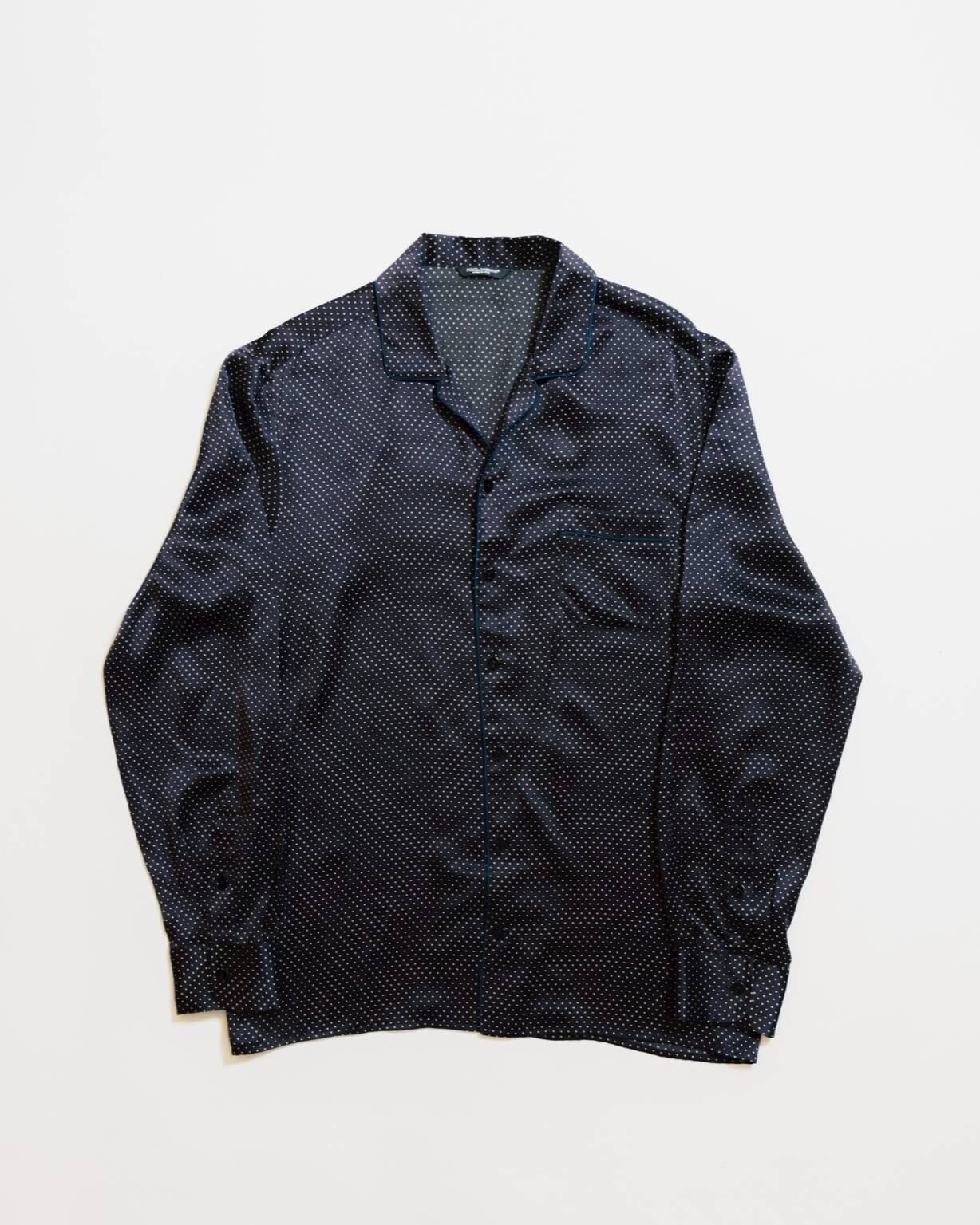 シルク特有の上品な光沢と流れるような落ち感が特徴で、肌に触れた瞬間に分かる極上の質感。ネイビー地に配されたドットパターンと、同色のパイピングによるアクセントが繊細なコントラストを生み、リラックスした雰囲気の中にもエレガンスを感じさせます。近年のコレクションに見られる“Luxury at Ease”の哲学を体現した一着で、パジャマシャツのような抜け感と、現代的なシルエットが共存。