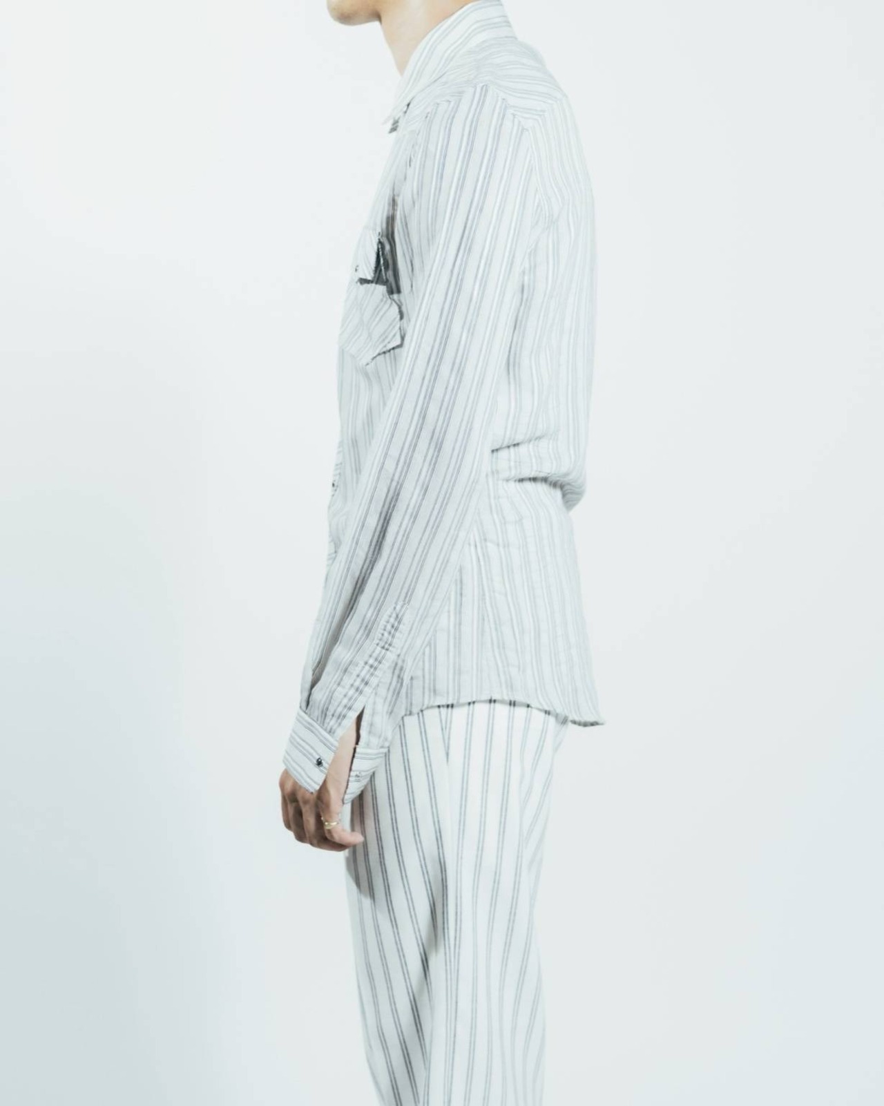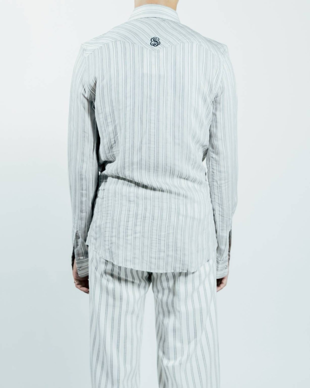 シャープなヨークラインと長めのカフス、規則正しいストライプが描く縦のラインが、構築的で洗練された印象を生み出しています。クラシカルなディテールを保ちながらも、現代的なミニマリズムで再解釈されており、シャツ単体でもアウターのような存在感を放ちます。